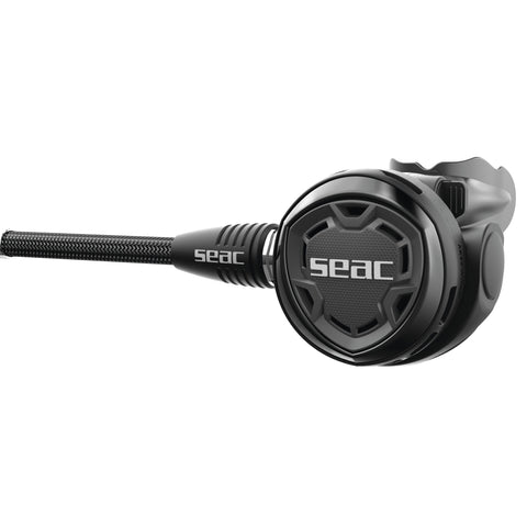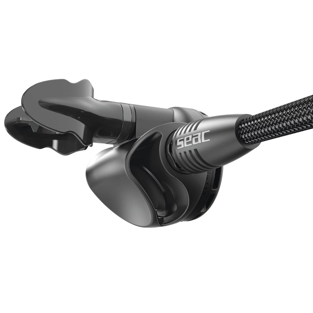 大きめに設計されたパージボタンは、2種類の素材を使用した柔らかいPU製で、SEACロゴを際立たせるデザインです。光沢とマット仕上げを組み合わせたフロントカバーと一体化しており、厚手のグローブ着用時でも操作しやすく、水の流れも最適化。呼吸抵抗を軽減するとともに、前面と側面の開口部の相乗効果により、水流によるフリーフローの発生も抑えます。